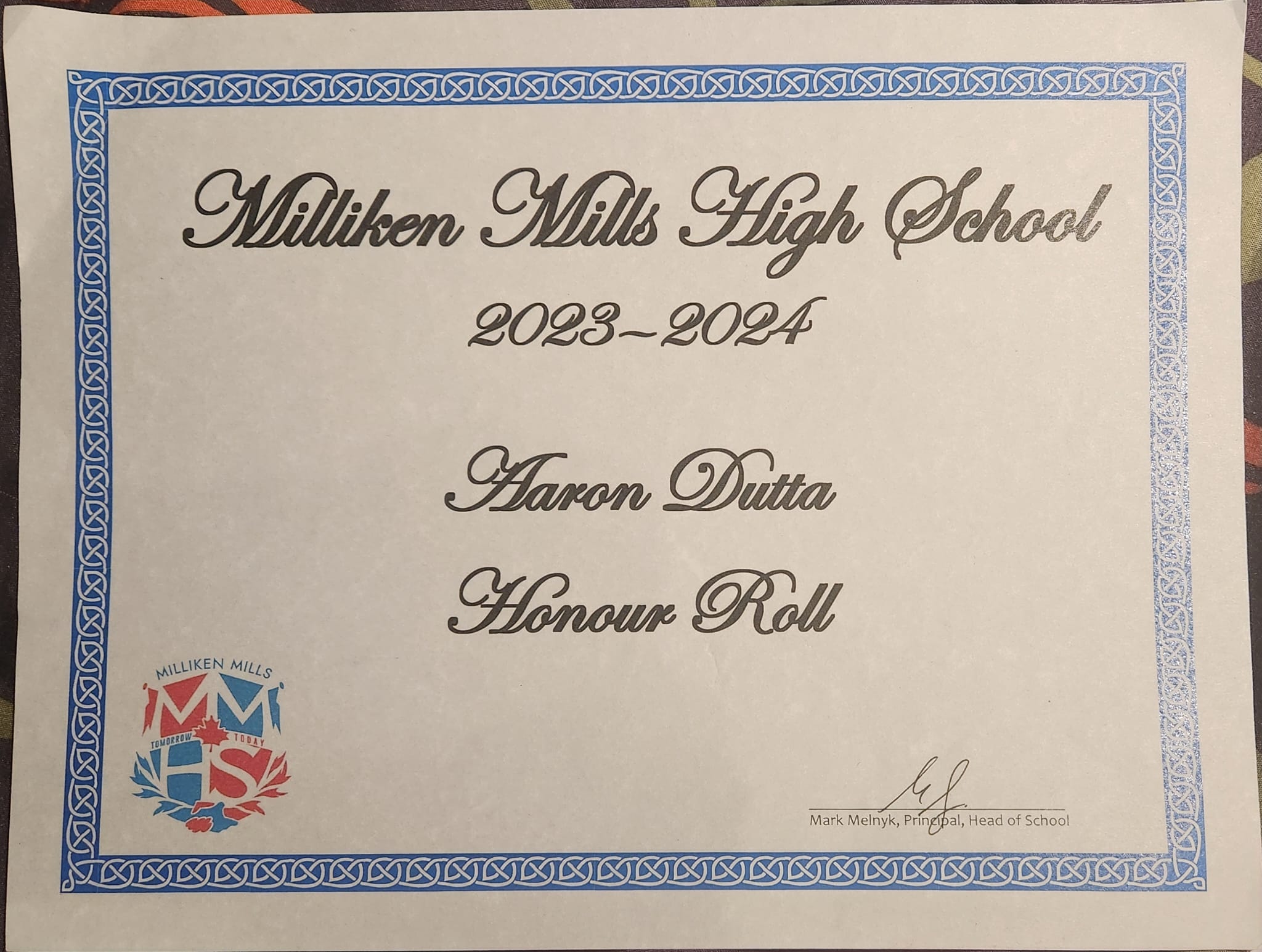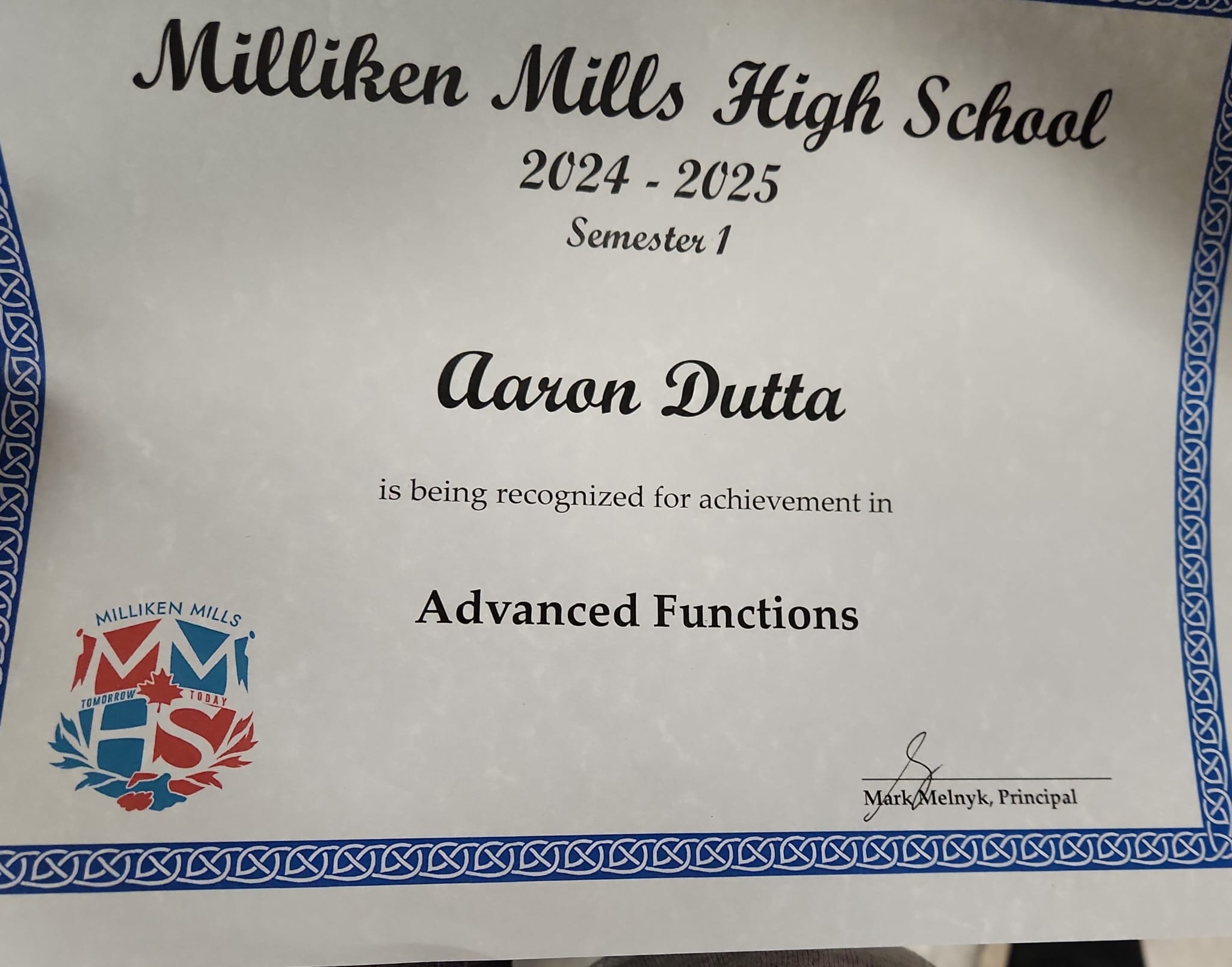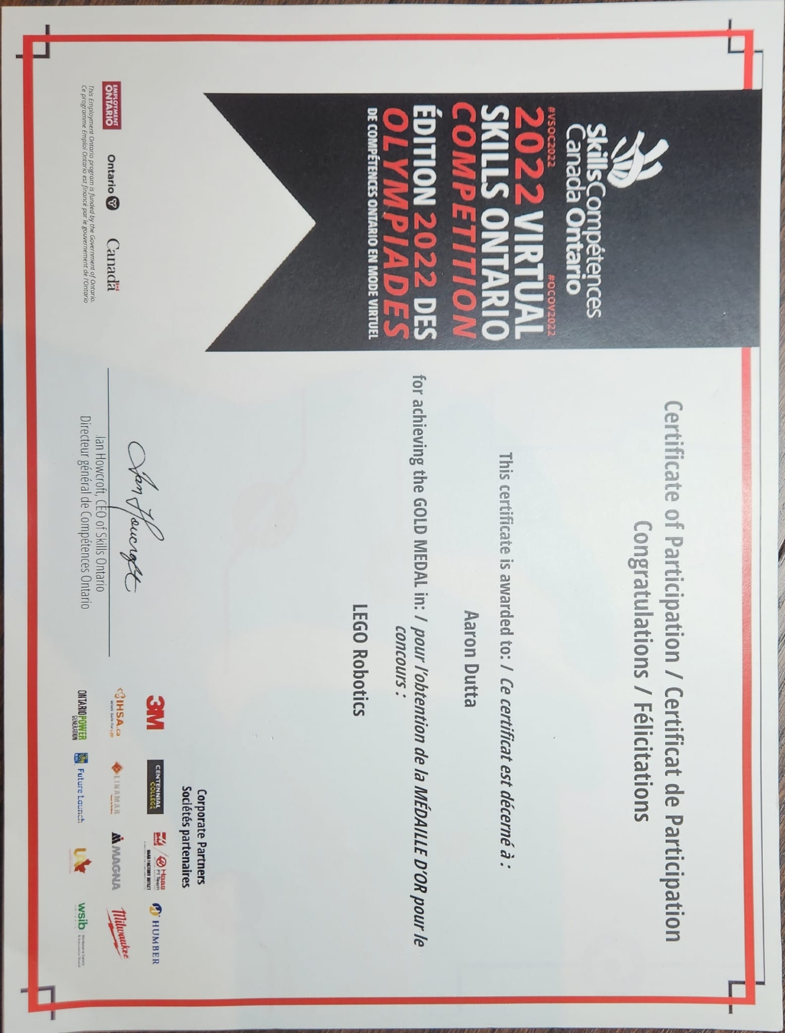 - Awarded first place certificate and a banner for the school representing York Region in a team of 4.