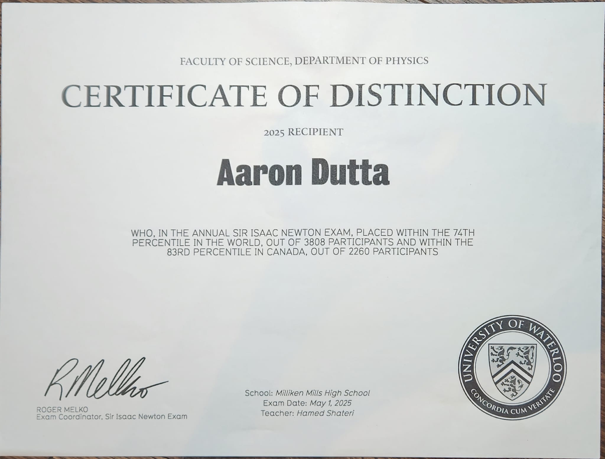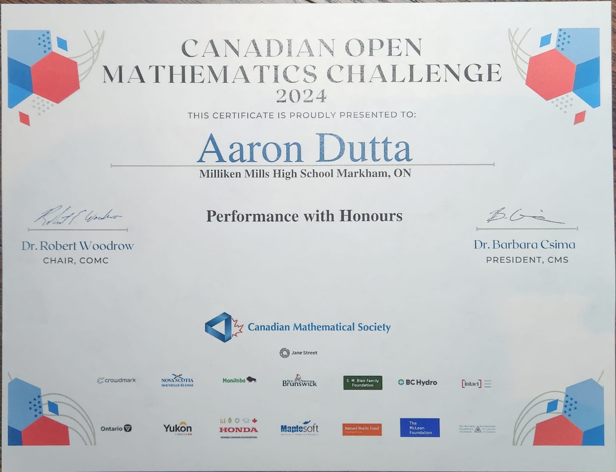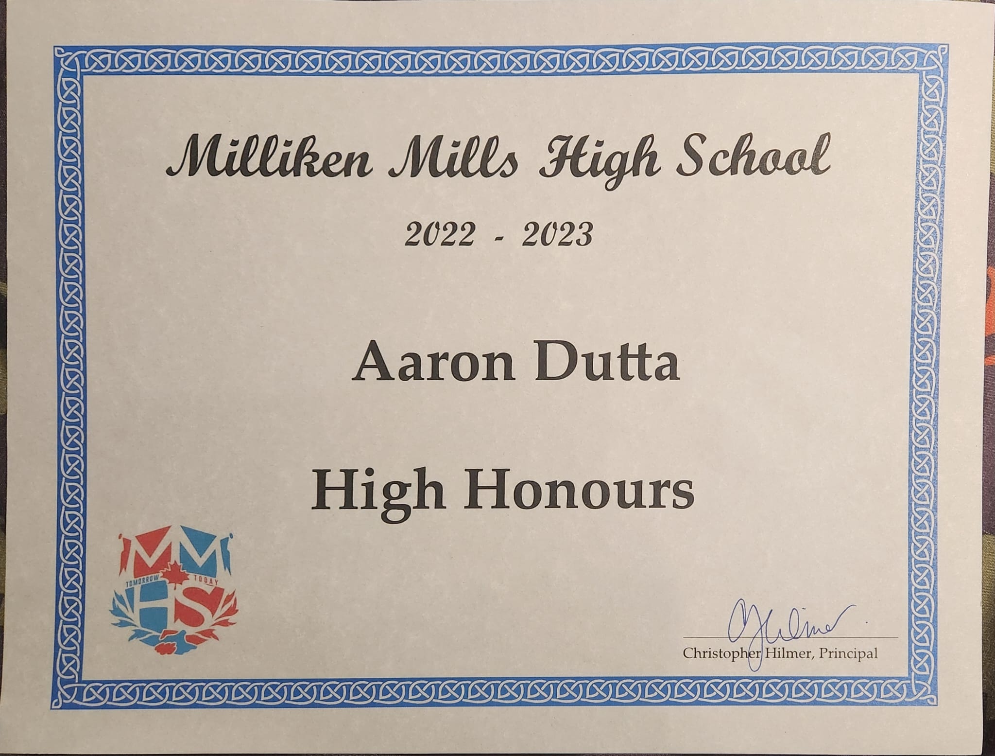 - Awarded first place certificate and a banner for the school representing York Region in a team of 4.