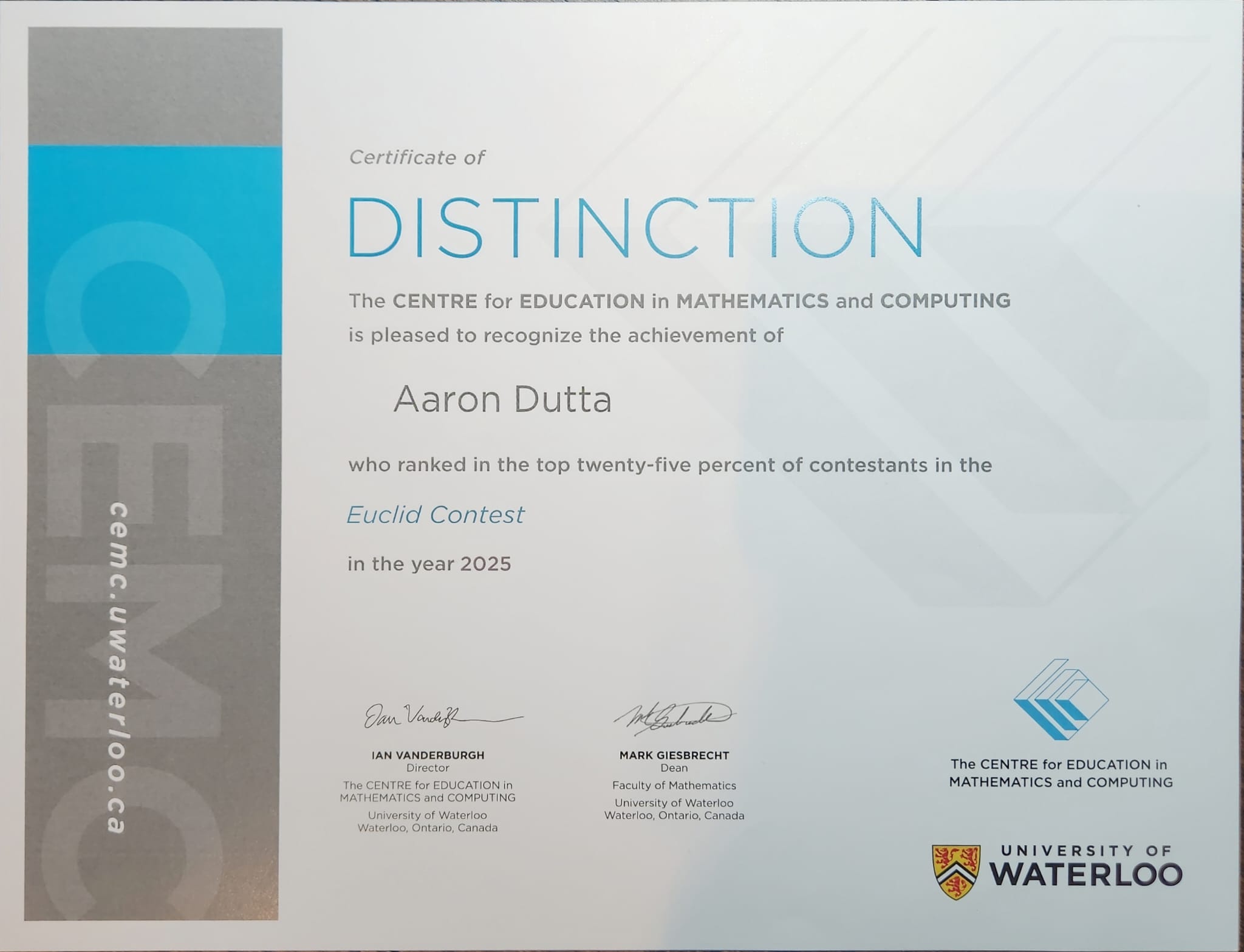 - Invited to Lloyd Auckland Invitational Mathematics Workshop due to being an outstanding achiever on the contest