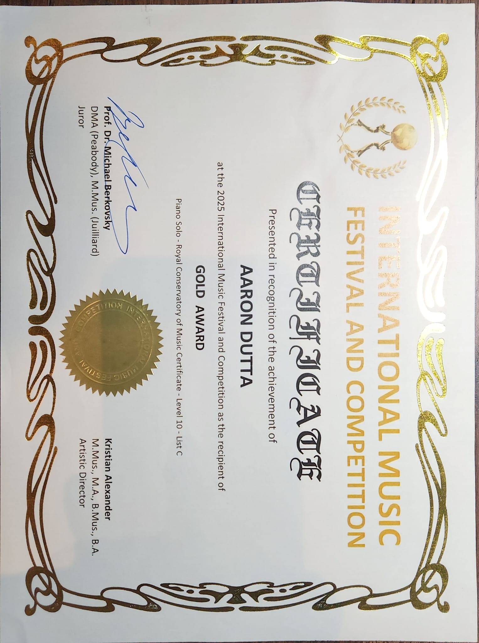 - Awarded three gold medals and a scholarship for competing in the Levels 6-ARCT repertoire category